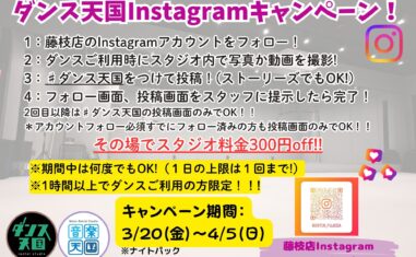ダンス天国からダンスご利用者様へ、どなたでもお使いいただけるお得な割引キャンペーン!開催店舗:ダンス天国・浜松市野店開催期間:2026年3月20日(金)~2026年4月5日(日)ご利用方法①浜松市野店のInstagramアカウントをフォロー...