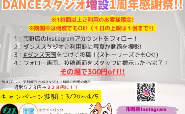 NEWS 【3月~4月 ダンス天国・浜松市野店】DANCEスタジオ増設1周年感謝祭!!